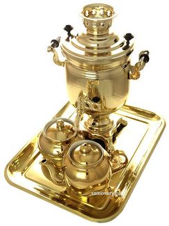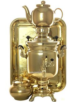 Набор цвета золото: латунный самовар с функцией автоотключения, металлический поднос, керамические заварочный чайник и сахарница с напылением "под золото" Наличные, VISA/Mastercard, б/н расчет Страна производства: Россия