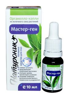 Натуроник® Мастер-ген, органелло-капли для глаз содержат природный комплекс млечного сока и концентратов растений, направленны на активацию функций гена (мастер-ген), который запускает механизмы зрительного аппарата и предупреждает изменения зрительного аппарата глаза. В составе капель содержится природный антиоксидант карнозин, который защищает глаза от разрушения светом, а также таурин, предупреждающий катаракту и глаукому. Природный натуральный состав капель эффективно устраняет инфекционные, бактериальные и воспалительные процессы глаз (конъюнктивит, стафилококковая инфекция, ячмень, демодекоз), снимает покраснение, слезоточивость, усталость и раздражение глаз, вызванные различными факторами, включая аллергические.