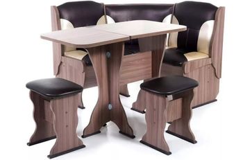 В комплект набора входят скамья большая, скамья маленькая, угловой элемент, стол трансформер и два табурета. Скамьи и угловой сегмент имеют мягкие спинки и сиденья, которые обтягиваются качественной экокожей. Варианты цветового решения экокожи позволят подобрать набор, подходящий под Ваш интерьер. Также в скамьях имеются ящики для хранения мелких предметов.
