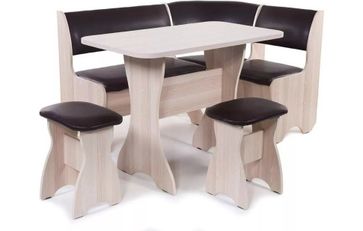 Кухонный набор Тюльпан дополнит мебельный гарнитур Вашей кухни. Он удобен в пользовании, имеет мягкие сиденья и спинки, оборудован ящиками для хранения. В состав набора входят: уголок, стол и две табуретки с мягкими сиденьями. Размеры кухонного уголка: Д1000 x Ш1350 х В840 мм Размеры стола: Д1000 x Ш600 х В750 мм. Размеры табурета: Д380 x Ш300 х В450 мм. Кухонный уголок может собираться на любую сторону. Столешница стола пластиковая термостойкая. Обратите внимание на кухонный набор Тюльпан в цвете ясень светлый/умбер. None Есть доставка.