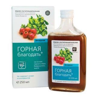 Натуральный безалкогольный медовый взвар «Горная благодать® вечерняя» содержит растительный комплекс, который способствует устранению эмоционального напряжения и агрессии, чувства тревоги, оказывает гармоничное успокаивающее действие, помогает спокойному засыпанию и глубокому сну. None