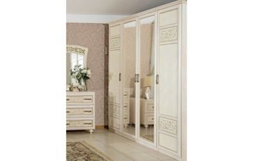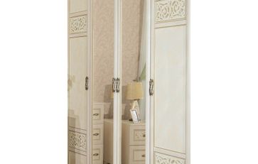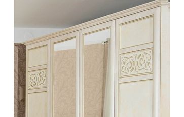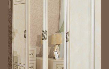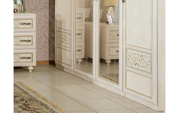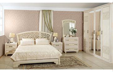 По-настоящему роскошной спальню делают оригинальная ажурная фрезеровка, оттенённая золотистым напылением, восхитительные ручки – вензеля, декоративные ножки оригинальной формы.