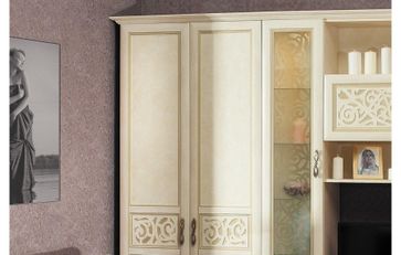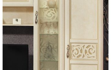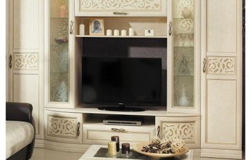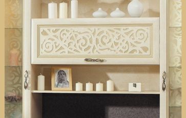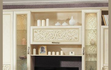 Здесь используются классические элементы дизайна: рамочные фасады, ажурная фрезеровка,оттенённая золотистым напылением. С ними гостиная выглядит роскошно.