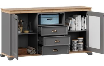 • Справа и слева за дверями глухими по одной нише с полкой • Максимальная нагрузка на полку – 15 кг • Петля вкладная с доводчиком. Угол открывания 950 • Ручки-ракушки и ручки-кнопки старая бронза • По центру открытая ниша и 3 выдвижных ящика. Размер фасада ящика - 502х148 мм • Максимальная нагрузка на ящик – 15 кг • Комод рекомендуется крепить к стене с помощью угловой подвески. Подвеска в комплекте. • Крепеж для подвески к стене приобретается дополнительно. None
