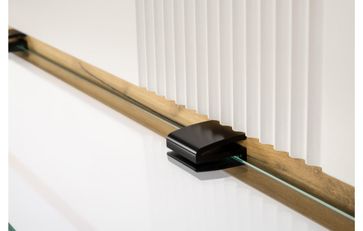 • На вертикальной панели, которая крепится к стене с помощью специальных навесов, закреплена стеклянная полка при помощи туканов. • К вертикальной панели закреплена декоративная накладка. None