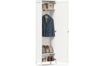 • За распашной дверью по одной полке вверху и внизу шкафа. • Под полкой закреплена выдвижная штанга. • Максимальная нагрузка на полку - 15 кг. • Максимальная нагрузка на штангу – 15 кг. • Шкаф установлен на опорные вертикальные рамы, выполняющие функцию опор. Высота опор 100 мм. • Шкаф крепится к стене с помощью подвесок. • Подвески в комплекте. • Крепление для подвесок к стене приобретается дополнительно. None