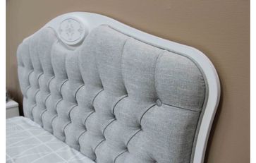 Размер спального места 900х2000 мм. Ортопедическое основание в комплекте, устанавливается на продольные стенки. Высота спального места с учетом матраса (180 мм) составляет 450 мм. Необычная по форме мягкая спинка с тканью и оригинальным рисунком. Царги и изножье с оригинальным рисунком. По углам изножья округлые вставки из ПСП. Опоры кроватей в изножье из ППУ, высота 200 мм, цвет белый None