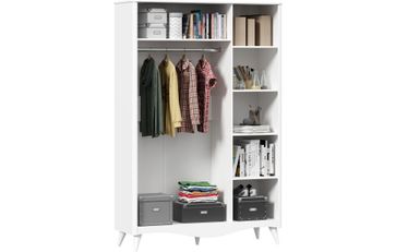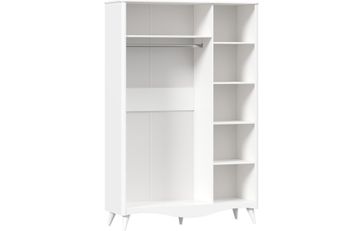 Шкаф разделен на 2 отделения. Правое с 5-ю нишами. Левое отделение с 1 штангой и 1 полкой вверху за двумя распашными дверями. Двери распашые щитовые с рисунком По углам корпуса округлые вертикальные вставки из ПСП. Внизу декоратиная планка в качестве цоколя Максимальная нагрузка на полку - 15 кг Опоры ППУ, высота 200 мм, нерегулируемые Шкаф крепится к стене с помощью угловой подвески. Подвеска в комплекте. Крепление для подвески к стене приобретается дополнительно. None