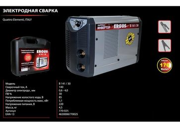 - Аппарат электродной сварки, инвертор ERGUS B 141 30 (140А, ПВ 30%, 4.0 мм, 4.6 кг, 220В, КЕЙС) по выгодной цене 6 300 р. руб.;