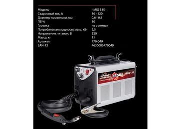- Аппарат полуавтомат. сварки, инвертор ERGUS i-MIG 135 (120А, ПВ 30%, 10кг, 220В) по выгодной цене 9 900 р. руб.;