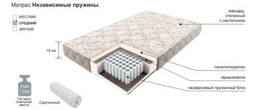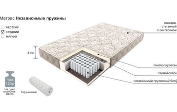 Матрас Comfort независимые пружины — классический ортопедический матрас, в состав которого входят: 1. блок независимых пружин (280 пружины на 1 кв.м.). 2. наполнители: войлок термоскреплённый плотностью 500 г/кв.м. и пенополиуретан толщиной 20 мм. 3. чехол (покрытие) из жаккарда. Матрас отличается высокой степенью адаптации к особенностям строения тела и точечным распределением нагрузки. Вес тела распределяется равномерно по всей поверхности, матрас повторяет контуры вашего тела, позволяя позвоночнику оставаться ровным, а всем мышцам находиться в расслабленном состоянии. Хлопковый жаккард, стеганный на синтепоне с глубокой стёжкой повышает износоустойчивость и украшает матрасы Comfort. Стежка делает поверхность матраса выпуклой и придает дополнительную упругость. Материал - пенополиуретан, войлок, жаккард, стеганный на синтепоне. Пружинный блок - блок независимых пружин (280 пружины на 1 кв.м.). Рекомендуемая нагрузка - 120 кг на одно спальное место. Жёсткость средняя. None Страна производства: Россия Есть доставка.