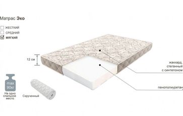 Матрас Эко – это современный безпружинный матрас из пенополиуритана. Чехол из вискозного жаккарда с растительным дизайном, стеганный на синтепоне, износоустойчив. Технические характеристики: Материалы: ппу, синтепон жаккард. Пружинный блок: Беспружинный Жёсткость: ниже средней. Допустимая нагрузка: 90 кг. Гарантия: 3 года (при правильной эксплуатации). None Есть доставка.