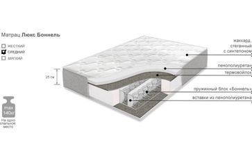 Матрас Люкс усиленный боннель с повышенным уровнем комфорта средней жесткости. Материалы: пенополиуретан, войлок, синтепон, жаккард. Пружинный блок: блок: усиленный "Боннель" Жёсткость: средняя. Допустимая нагрузка: 140 кг. None Есть доставка.