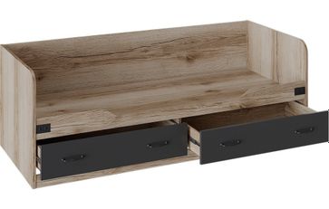 Кровать Окланд — функциональная модель со встроенными ящиками. Кровать в стиле лофт изготовлена из ЛДСП в сочетании древесного декора Дуб Делано и матового Черного. Ручки ящиков металлические, для украшения использованы декоративные металлические накладки. Направляющие ящиков — шариковые. Основание спального места настил ДСП. Матрас приобретается дополнительно. None Есть доставка.