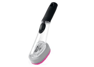 Щетка для мытья посуды состоит из губки, закрепленной на длинной ручке, и диспенсера для моющего средства.