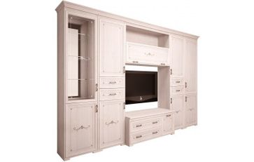 Модульная гостиная Афродита — фаворит среди интерьеров для мечтательных и романтичных натур. Этот стиль отлично подойдет как для квартиры, так и для загородного дома. Он создает очень нежный и даже слегка воздушный вид вашей комнаты, где в свойственной французам элегантной манере объединены красота и комфорт. Модули изготовлены на каркасе ЛДСП, фасады — МДФ в профиле. Фасады декорированы изящным узором, ручки металлические, вензельные. Модули входящие в комплект: