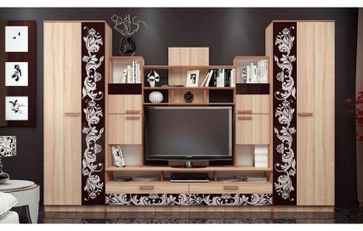 Гостиная Багира — создана для того, чтобы украсить вашу квартиру. Современный вариант стенки выполнен из ЛДСП. Цвет корпуса и фасада: Дуб сонома. Отделка: художественное стекло, возможны 2 варианта рисунка: каштан, кашемир. Сочетание трехмерной текстуры Дуб сонома и модного стекла с художественном рисунком делает гостиную лаконичной и стильной. Внутренне наполнение шкафов показано на третьем фото. None Страна производства: Россия Есть доставка.