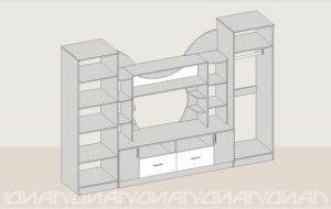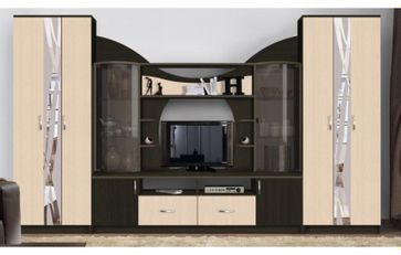 - центральную секцию (полки для книг, тумба под телевизор, шкафы-витрины с тонированным гнутым стеклом);