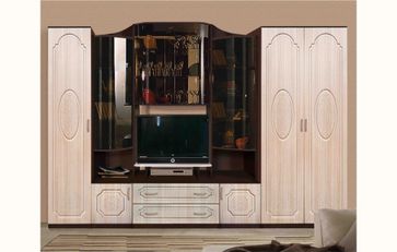 - Центральную секцию (тумба под телевизор, шкафы-витрины с тонированным гнутым стеклом);