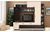 тумба ТВ с разновеликими выдвижными ящиками, рядом секция за распашной дерцей, над ней — витрина за стеклом с квадратной матово-тонированной структурой, пенал с полками за распашной дверью и стеллаж с открытыми полками, сверху — открытая полка и секция за подъемной дверью.
