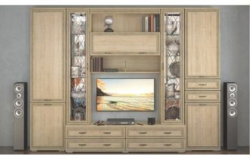 ЛШ-3 Пенал с ящиками (540х350х2212); ЛТ-2 Тумба для ТВ-техники (1800х450х412); ЛН-2 Полка навесная (1080х266х266); ЛН-3 Полка навесная (1080х350х704); ЛШ-7 Пенал-витрина (надставной) (360х350х1800) — 2 шт.; ЛШ-2 Пенал платяной с выдвижной штангой (540х350х2212). None Есть доставка.