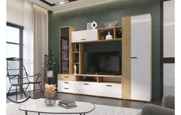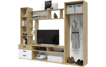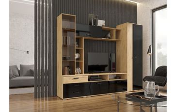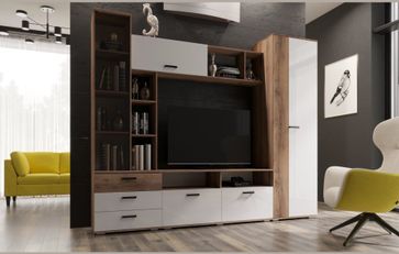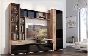 Гостиная Крокус — готовый комплект для зала. Корпус гостиной изготовлен из ЛДСП в древесном декоре, фасады глянцевые ЛДСП. Комплект включает: •комод 3 ящика, 2 фасада глянцевые, один в древесном декоре, •витрина с 3 полками ЛДСП за стеклянной распашной дверцей, •открытый стеллаж 2 полки ЛДСП, •тумба ТВ 2 ниши, 2 секции за откидными дверьми, •полка с секцией за откидной дверью и 2 открытые секции, •шкаф для одежды со штангой и антресольной полкой. None Страна производства: Россия Есть доставка.