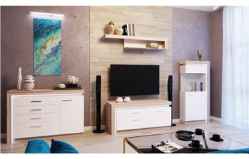 Модульная гостиная Люмен — композиция, выполненная в белом глянце. Каркас модулей изготавливается из ЛДСП 16 мм в декоре Дуб Сакраменто, фасады из МДФ 16 мм в глянце Белый снег. Задняя стенка элементов изготовлена из ДВПО Белый. Модули, за исключением навесных полок, изготавливаются в правом и левом исполнении. Ящики укомплектованы шариковыми направляющими полного выдвижения. Ручки металлические в цвете Сатин светлый.