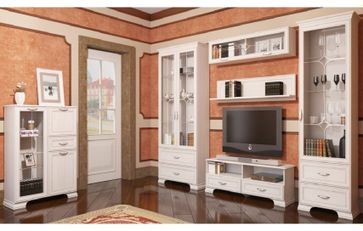 Модульная гостиная Венеция — выполнена в строгом классическом стиле. Модули изготовлены из ЛДСП 16 мм в декоре Бодега светлая и установлены на регулируемые опоры. Двери шкафов оборудованы петлями с доводчиками, ящики — шариковыми направляющими полного выдвижения. Со светлым декором фасадов гармонируют ручки металлические в цвете Хром глянцевый с белой вставкой. В комплект входят модули: