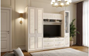 Стенка Каир — компактная композиция для жилой комнаты. Комплект выполнен на корпусе ЛДСП 16 мм в цвете Ваниль, фасады — МДФ Ясень жемчужный с объемным тиснением рисунка и 3D эффектом, рельеф декорирован патиной. В составе стенки: