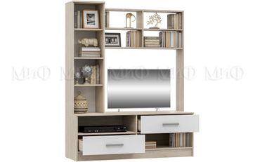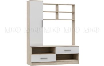 Гостиная Мартина — готовый комплект для зала, изготовленный из ЛДСП. Корпус выполнен в древесном декоре Дуб Сонома, фасады — Белый глянец. Гостиная оборудована 2 выдвижными ящиками и 2 нишами в тумбе ТВ, пеналом с 3 полками и стеллажом с открытыми полками. None Страна производства: Россия Есть доставка.