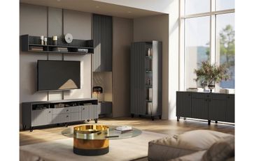 Модульная гостиная Оливия — серия мебели в стиле Лофт. Напольные элементы установлены на черные металлические опоры. Материал корпуса ЛДСП. Материал фасада МДФ с рифленой фактурой. В составе комплекта: •шкаф (836х426х2227) 4 стеклянные полки с подсветкой, отделение для одежды с выдвижной штангой и антресольной полкой;•комод (2000х426х830); •тумба навесная №1 (800х346х330); •шкаф навесной большой (400х346х1636) 3 полки ЛДСП — 2 шт.; •полка (1966х298х380);•тумба ТВ (2000х426х668). Размер ниши под ТВ - 2000х1200. None Страна производства: Россия Есть доставка.