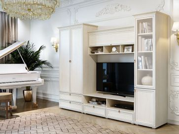 •Шкаф платяной (900х528х2150);•Тумба ТВ (1400х528х452);•Полка навесная (1400х336х555);•Пенал со стеклом (450х528х2150).