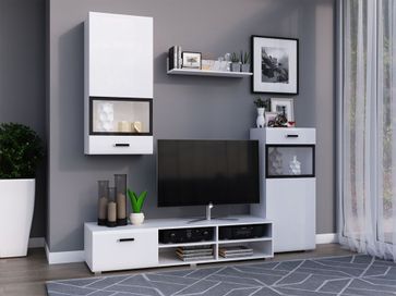 Модульная гостиная Рио — современное решение для небольшой комнаты. Гостиная выполнена на каркасе из ЛДСП, фасады — МДФ глянец. Белый декор удачно сочетается с любым интерьером. В составе комплекта: •тумба под тв (1620х350х520); •полка навесная (800х150х200); •пенал навесной (550х356х1220); •шкаф (стекло) (550х356х1220). None Страна производства: Россия Есть доставка.