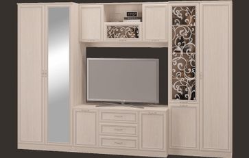 В комплекте модули: Шкаф для одежды 2х дверный с зеркалом, Шкаф для белья, Центральный модуль, Шкаф для книг со стекл дверкой.