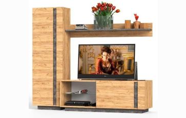 Если Ваша гостиная выполнена в урбанистическом стиле данный набор станет настоящей находкой. Выполненная под натуральный цвет и фактурой свежеспиленного дерева в сочетании серого цвета серого камня, со стеклянными вставками, гостиная освежит интерьер и добавит теплые цвета в дизайн вашей квартиры. В состав набора входит: Тумба 10.85 Шкаф комбинированный 10.05 Полка 10.110 None Есть доставка.