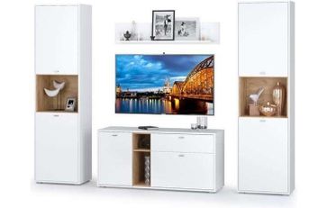 Оригинальная стенка для гостиной выполненная в белом цвете в сочетании теплого цвета древесины Дуб Золотой. Выдержана в традициях минимализма, прекрасно подойдет не только для помещения выполненного в идентичном стиле, но в любом другом современном стиле. Не смотря на то что набор имеет воздушную компоновку, он совмещает в себе не только красоту, но и удобность и практичность. В шкафах и на полке Вы сможете положить вещи, поставить книги. Тумба подойдет не только размещения телевизора с широкой диагональю, но и как система хранения. Состав комплекта: Шкаф комбинированный 10.04 (2 шт.) Тумба 10.91 Полка 10.107 Модель изготовлена из ЛДСП 16 мм, кромка ПВХ. Распашные двери установлены на четырехшарнирные петли, выдвижные ящики - фолдинги на шариковых направляющих. Ручки - ABS-пластик в цвете сатин. None Есть доставка.