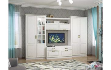 Набор для гостиной выполненный в приятной светлой цветовой гамме и колониальном стиле. Стенка включает в себя все необходимые модули для размещения телевизора, предметов интерьера и посуды, вещей и белья.