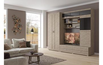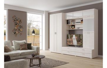 Модульная гостиная Лотос — композиция в стиле Арт-Деко. Фасадная часть гостиной — фрезерованное МДФ в пленке ПВХ с использованием черного или белого стекла. Задняя стенка гостиной выполняется из ЛДВП в цвет корпуса. В серии используется ручка 96 мм (сатин светлый) пластмасса. В тумбах и шкафах используются регулируемые опоры L-20.