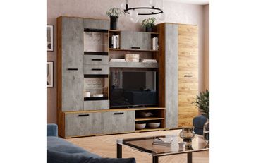 Гостиная Трамп - это стильное решение для ценителей качественной, функциональной и, без сомнения, трендовой мебели для дома. Всего двух модулей, центральной секции и шкафа, хватит, чтобы обустроить гостиную с ТВ-зоной (размер ниши под телевизор - 1086 х 684 х 460 мм) и зону хранения одежды и вещей. Стиль лофт, в котором выполнена мебель, придаст Вашему интерьеру особенный характер. Корпус цвета крафт и фасады в декоре метрополитан грей смотрятся очень оригинально, но при этом солидно. Центральная секция создана, чтобы решать вопрос хранения в малогабаритных квартирах и студиях. Вместительный двухстворчатый шкаф с ассиметричными дверцами придает центральной секции завершенный вид.
