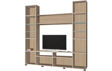 Тумба напольная под ТВ (2000х381х491) имеет две откидные створки на газлифтах (секретерных) и два открытых проема под технику размером 593х154 мм, ниша под ТВ 1222х876 мм; Два пенала (390х317х1537), надставленные на тумбу имеют открытую нишу высотой 329 мм и закрытую с 3 полками; Полка из 2-х горизонтальных деталей, расстояние между которыми 27,2 см, имеет общий габаритный размер 1222х218х362).