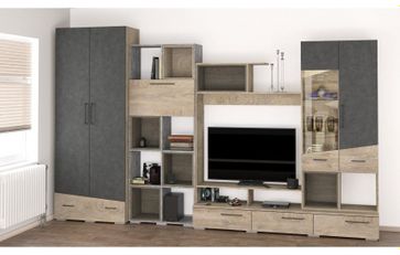 Модульная гостиная Паскаль — композиция для создания интерьера в стиле Лофт в модных цветах и с оригинальной конструкцией модулей. Корпус изготавливается из ЛДСП Дуб эдгрейн необработанный с реалистичной текстурой натурального дерева, фасады — из МДФ с матовой пленкой в декоре Темный бетон, дополнительные используемые декоры: ателье светлый (ЛДСП каркас стеллажей), Ясень анкор темный (ЛДСП вставки в центральной секции и кубы). Модули комплектуются стильной металлической фурнитурой. В дополнение к основным модулям в серии представлены кубы, которые можно вставлять в ниши стеллажей и центральной секции и навесные дверцы. В комплектацию, как на фото, включены: