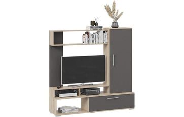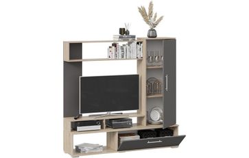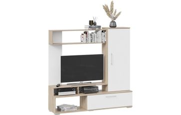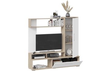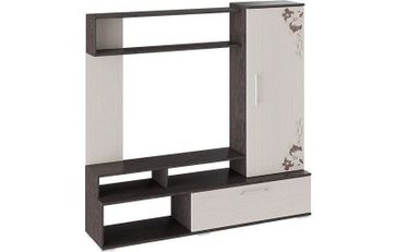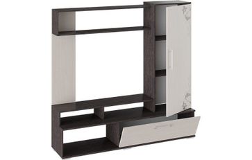 тумба ТВ с нишей и секцией за откидной дверцей, пенал с 3 полками ЛДСП за распашной дверью, открытая полка.