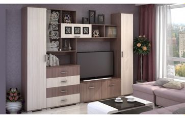 Модульная гостиная Рошель — композиция, выполненная в современном стиле, с использованием ЛДСП контрастных декоров. В серии представлены одно, двух и трехдверные шкафы, двух и трех дверные шкафы оборудованы тремя выдвижными ящиками и изготавливаются в 2 вариантах глубины. Для создания угловой композиции предусмотрен угловой шкаф. Центральную часть любой композиции занимает компактная тумба с вместительной нишей ТВ, двумя отделениями за распашными дверьми, встроенным 4-х ящичным комодом, витриной и полками для книг и сувениров. Модули изготовлены из ЛДСП, стеклянные вставки с рисунками. В композицию, как на фото, включены: