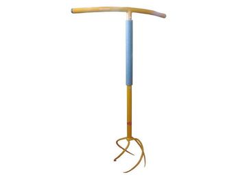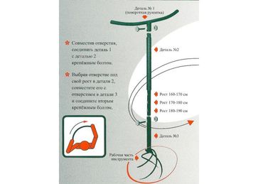 - Особенная, дугообразная, ручка рычаг. Спиралеобразные, жестко закрепленные, заостренные зубья рабочей части инструмента, выполненные из прочной закаленной стали. Три положения высоты инструмента: для людей ростом до 165 см, с 165 до 175 см и свыше 175 см.