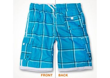 Внутри белая сетка в форме плавок. В пояс встроена резинка и изнутри - синтетическая белая тесьма для завязки-регулировки по размеру. Два передних кармана (внутри сетка), накладной боковой карман сбоку на правой штанине закрывается клапаном на липучке, задний карман справа закрывается клапаном на липучке.
