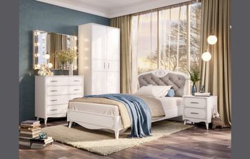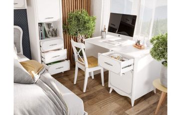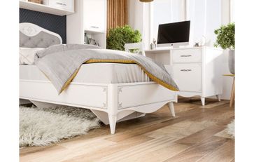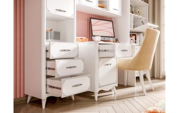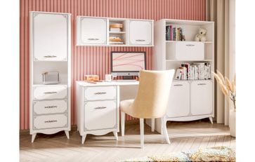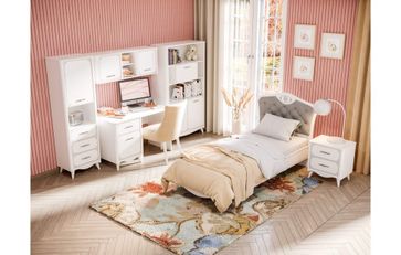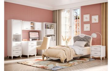 Мебель для молодежной комнаты «Элис» рассчитана на девочек младшего и среднего школьного возраста. Белоснежные фасады украшены тонким нежным орнаментом и изящными хромированными ручками. Девичий дизайн мебели подчеркивают фигурный нижний горизонт в сочетании с изящными невысокими ножками и округлые профили по бокам каждого модуля. Мягкое изголовье кровати отличается необычной формой, в центре которого расположен декоративный орнамент. Функциональный модульный ряд включает различные мебельные предметы, с помощью которых можно зонировать пространство, выделяя зону сна, работы, хранения. Кровать представлена в двух размерах по ширине - со спальным местом 900 и 1200 мм. None