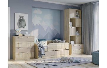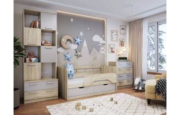 Набор оборудован замечательной кроваткой с бортиками и ящиками для постельного белья. В комплекте комбинированный стеллаж и комод.