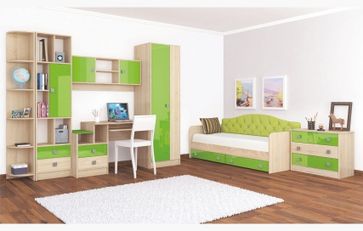 Кровать Колибри с ящиками (1892х880х600), Мягкая спинка СП-16 лайм с пуговицами (1855х55х405); Комод (820х435х780); Навесная секция (1200х250х500), Пенал (500х320х2000), Стол письменный (1200х550х750), Угловое завершение (300х300х2000), Шкаф (600х520х2000).