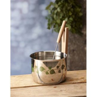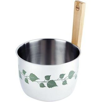 Банная шайка из высококачественной нержавеющей стали для любойбани. Летнюю тему создают рисунки березовых листьев, выполненные на наружной поверхности при помощи специальной технологии. Внутренняя поверхность - матовая. Ручкаиз обработанного масломбука.