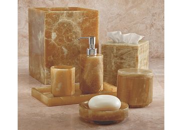 Сначала был тщательно отобран кусок оникса по его богатой окраске цвета карамели и прозрачности, затем были произведены все предметы для данной коллекции, формы которых выявили красоту каждого предмета. Золотой свет, играя на тщательно отполированных поверхностях, раскрывает волшебный рисунок камня .